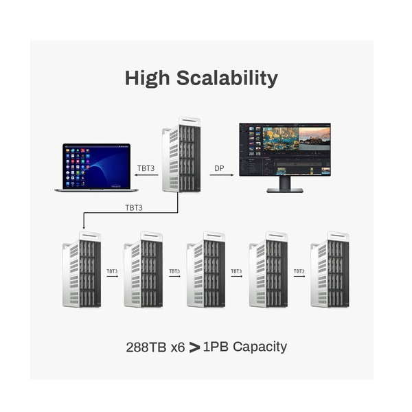 يتوافق TerraMaster's 16-bay D16 Thunderbolt 3 مع أقراص SATA مقاس 3.5 بوصة ومحركات أقراص SSD مقاس 2.5 بوصة، مما يسمح للمحترفين بالاستفادة من سعة تخزين إجمالية تصل إلى 288 تيرابايت. ونتيجة لذلك، يمكنك التأكد من أن الجهاز يوفر لك الأدوات التي تحتاجها للتغلب على أي تحدي تخزين.
