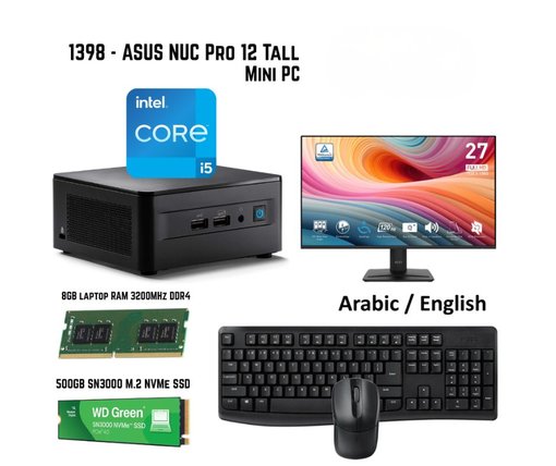 - حزمة ASUS 1398 NUC 12 Pro Tall Mini PC بمعالج i5 1240P وذاكرة 8 جيجابايت وسعة تخزين 500 جيجابايت مع نظام Windows 11 Pro ولوحة مفاتيح وفأرة Rapoo X1800PRO وشاشة MSI مقاس 27 بوصة PRO MP275