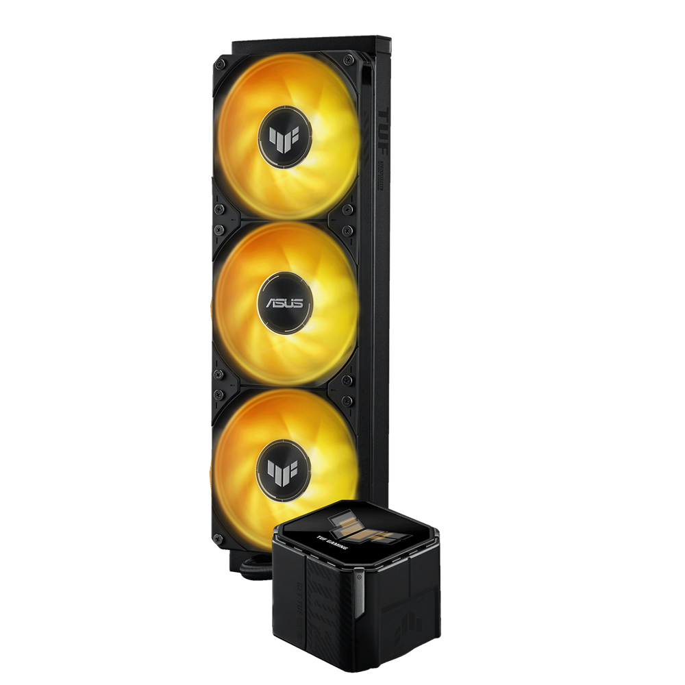 TUF Gaming LC III 360 ARGB LCD all-in-one liquid CPU cooler with pre-installed & integrated triple fans designed for high airflow and static pressure; 2.8″ LCD for hardware monitoring, custom GIFs and MP4 video clips