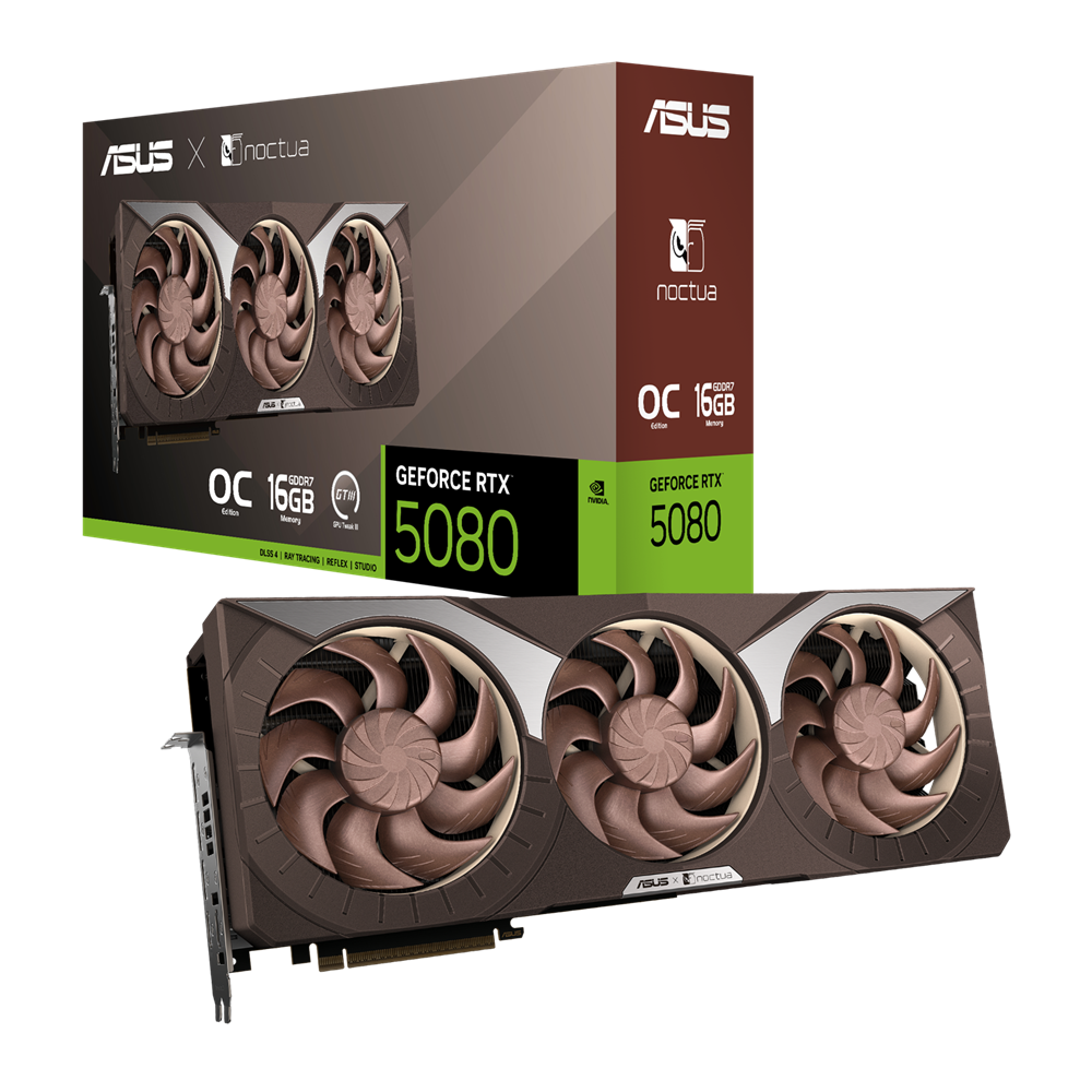 Co-engineered with Noctua, ASUS GeForce RTX™ 5080 Noctua Edition features three NF-A12x25 G2 PWM 120mm fans and a vapor chamber heatsink on a custom PCB for exceptional cooling with ultra-low noise—making it the quietest air-cooled GPU in its class. Perfect for Noctua fans, gamers, and creators seeking peak performance with minimal noise.